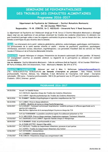 Séminaire de psychopathologie des troubles des conduites alimentaires à L’Institut Mutualiste Montsouris – 2016/2017